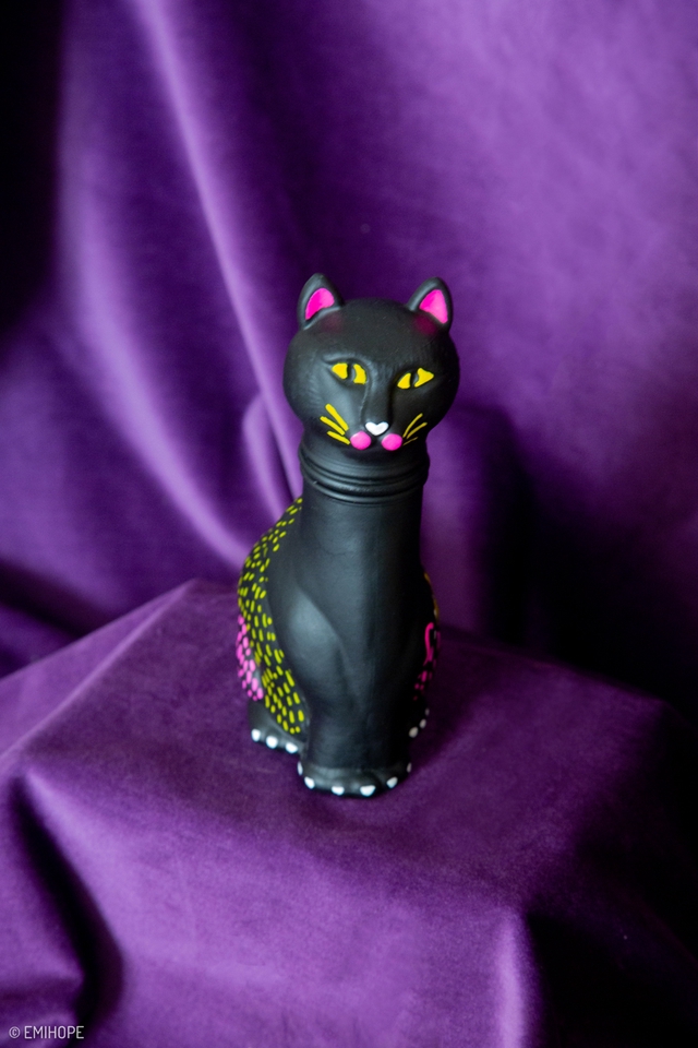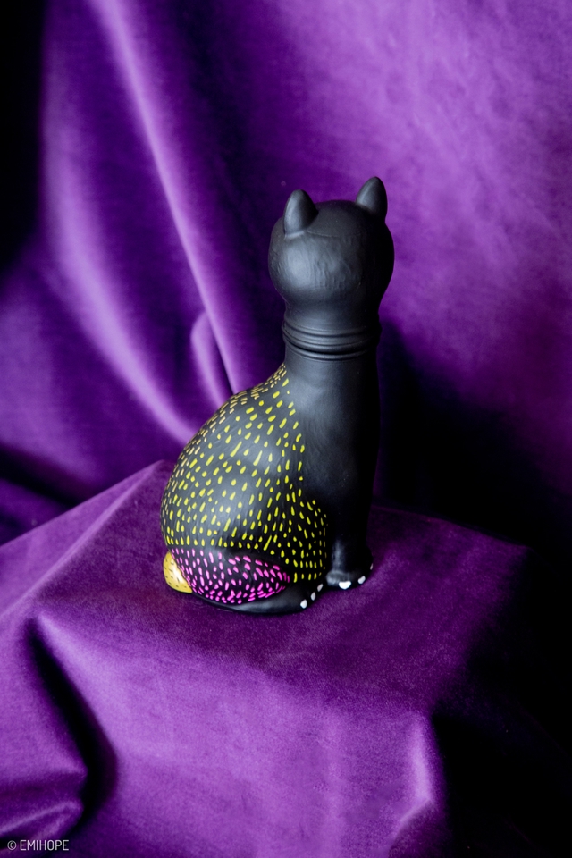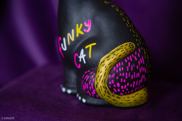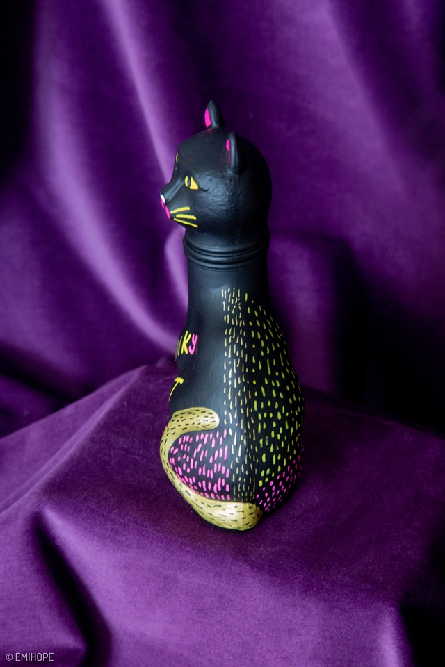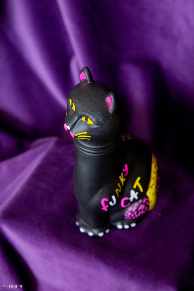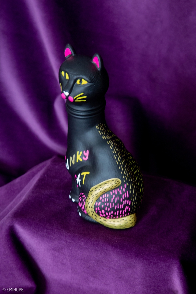 À l'origine, je suis un chat soufflé en verre, mais ma tête fût abîmée même s’il est toujours possible de la tourner. J’ai eu le droit à un petit relooking pour me porter chance mais aussi à celles et ceux qui me détiendront, je vous protègerais avec mes vibes de funk qui respirent la joie !