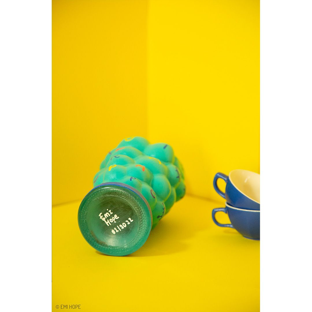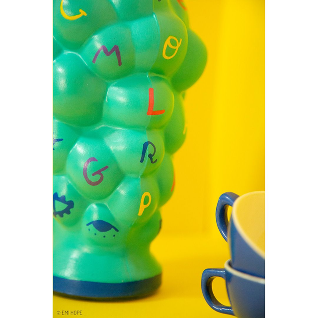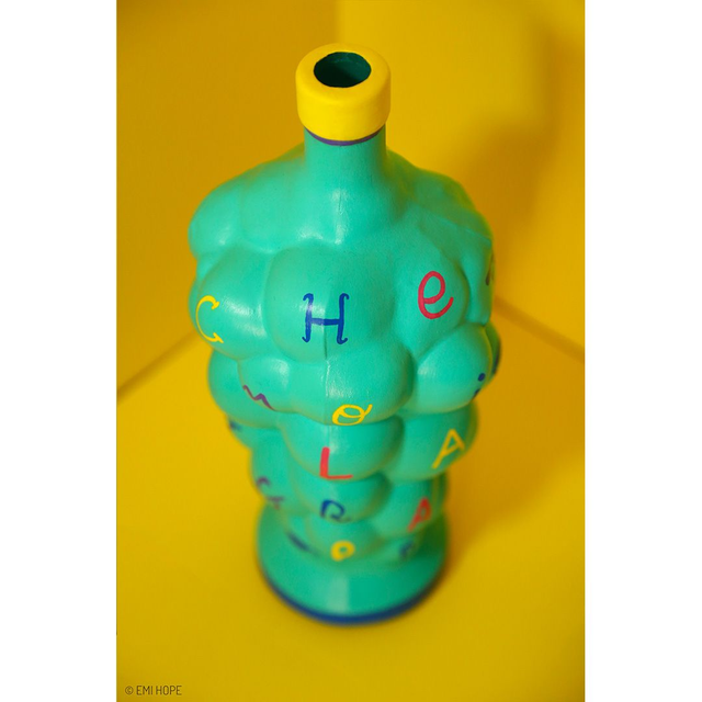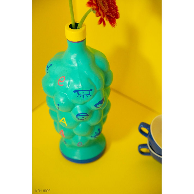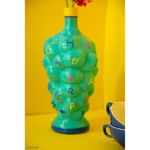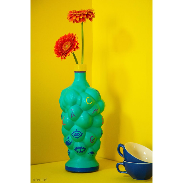 " À l’origine je suis une bouteille en verre utilisée pour aérer le vin, mais vu que mon goulot est abîmé, on m’a donné une seconde vie en me peignant à la main et en faisant de moi un joli vase pour vos plus belles fleurs ! Avec ma forme originale, je joue avec les lettres à travers cette expression: « Lâche-moi la grappe ». "